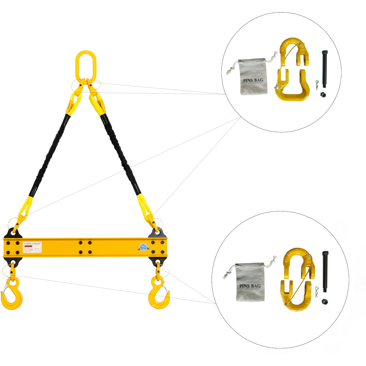 Our lifting spreader beams are for commercial and industrial use . Product is equipped with locking retaining pin web connectors for easy assembling and disassembling.  This feature allows to change round sling with different lengths at your request - no special tools needed.